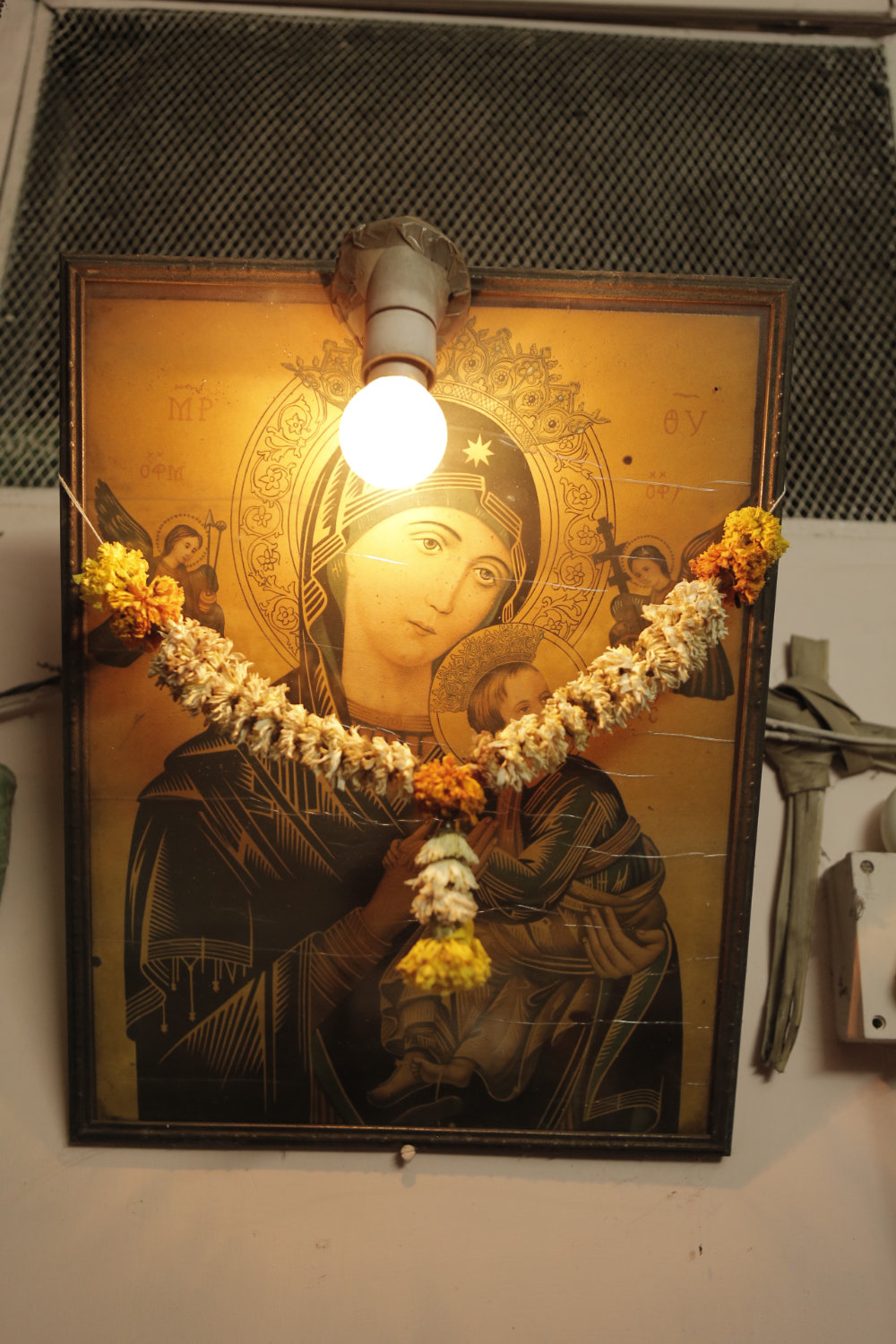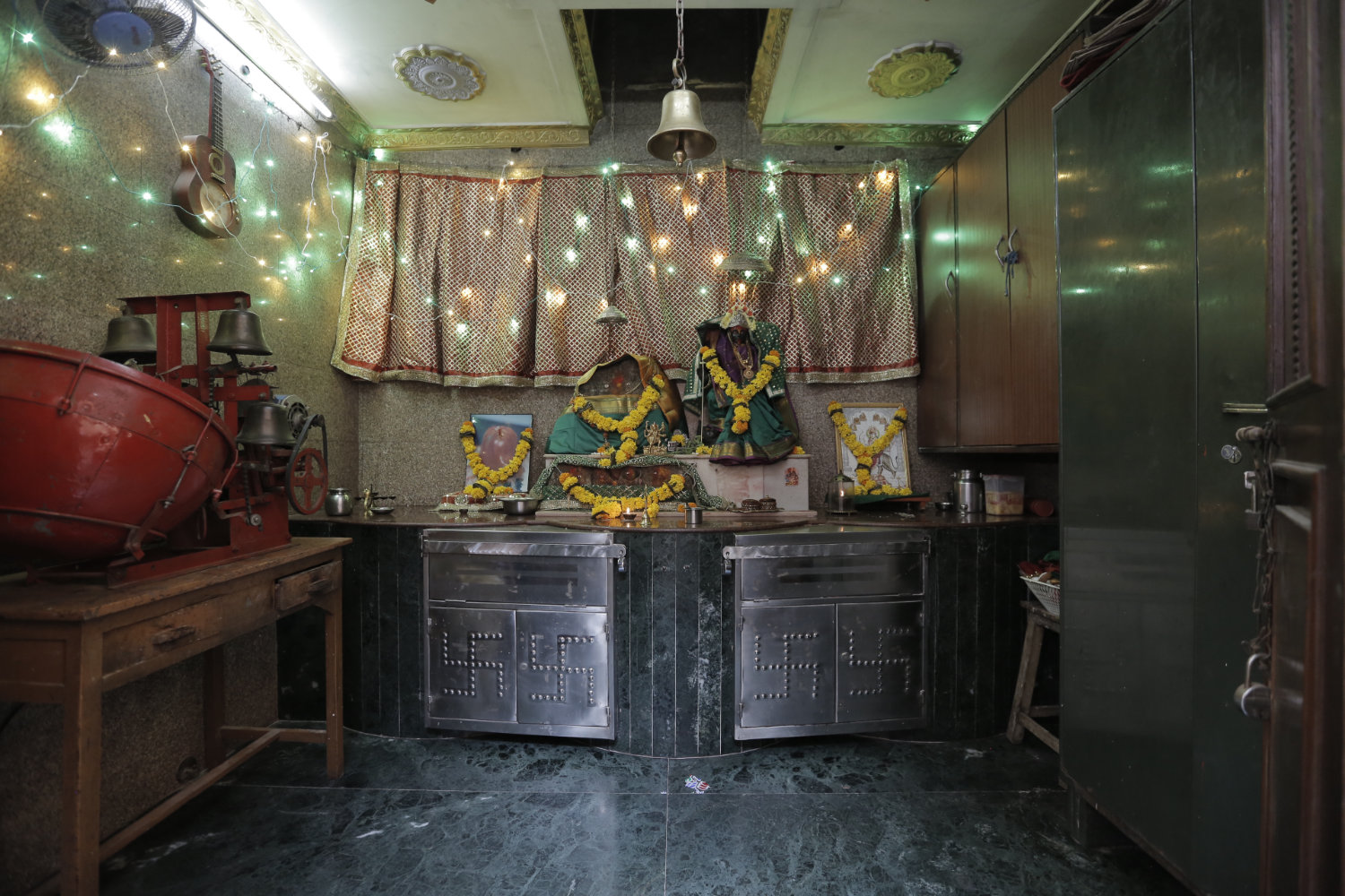 T lived in a chawl (tenement) with her son and daughter, her home painted confectionary pink and white. Her husband died of a heart attack two years ago, and although she used to work in a factory which made pens before her children were born, her children supported her after their father’s death. T was Christian and had formed a small community in her tenement together with her 40 years ago, T told us, when she was newly married and had just moved into her home there had been no other buildings around them, only fields. It was not uncommon for them to find snakes in their home. Her husband had inherited a small room from his father, and over the years, they slowly extended it to include a kitchen, living space, a room, and a storage area.