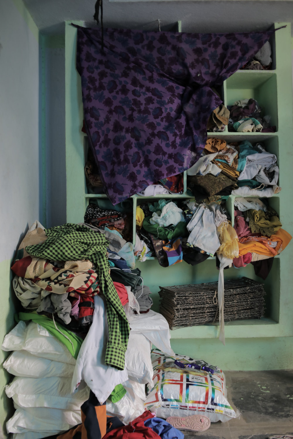 V lived with her youngest son, who is unmarried. Her two other sons, both married and with children, lived nearby in two tents made of blue and yellow tarpaulin. “After marriage and having children of our own it’s better we have privacy to maintain and deal with our family matters,” they said, and some of the tents had been occupied by the same people for as long as 15 years. V’s house was built with help from a government grant which covered half the expenses, but her family finds the bureaucratic requirements of these intimidating. As members of a Scheduled Caste they are eligible for state support, but the barriers to these - documents, filling forms, etc. - are very high for such low-income groups.