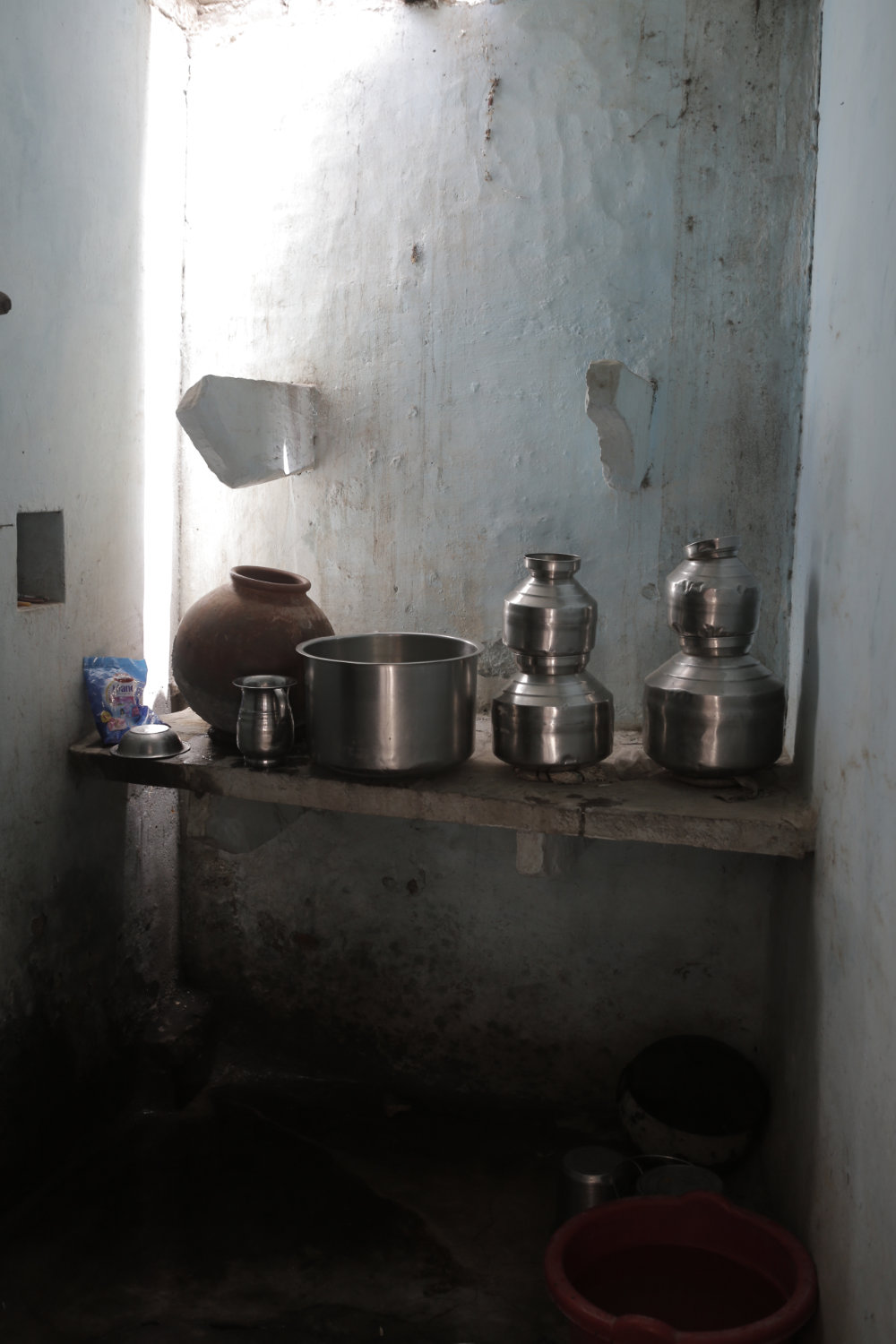 T was L’s wife, and together they had two sons and a daughter. Their children, L and T told us, would soon start renting a room in the nearby town and become tutors to earn extra money. N, their daughter, was helping her mother re-floor their house using reddish soil and cow dung from the family’s own cowshed, and L had just finished replacing old khapra (earthen) tiles which made up the roof with new ones. The tinted soil for the floor had been brought in especially as the colour of the soil in the surrounding area varied from light brown to black. L made sure that the roof had new tiles every year before monsoon so that the roof did not leak whenever it rained.