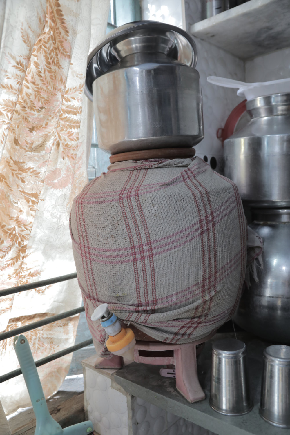 L's family lived in a one-room flat and shared two bathrooms with 9 other families. A big blue water storage tank outside their house simultaneously greeted all visitors to the house and defined the residents’ daily struggles to get sufficient water. The street in front of the house was generally peaceful, with the occasional sounds of children playing or women calling out to each other across the street. But at 9 am sharp, when the municipal water supply was turned on, everyone had only one thing on their minds: to collect as much water as they could. L married her husband, R, ten years ago. He worked as a labourer at a factory and she sewed clothes for people at home. The building they lived in was owned by a religious charitable organisation which provided lodgings for people of faith. A religious symbol for warding off bad energies hung above the front door.